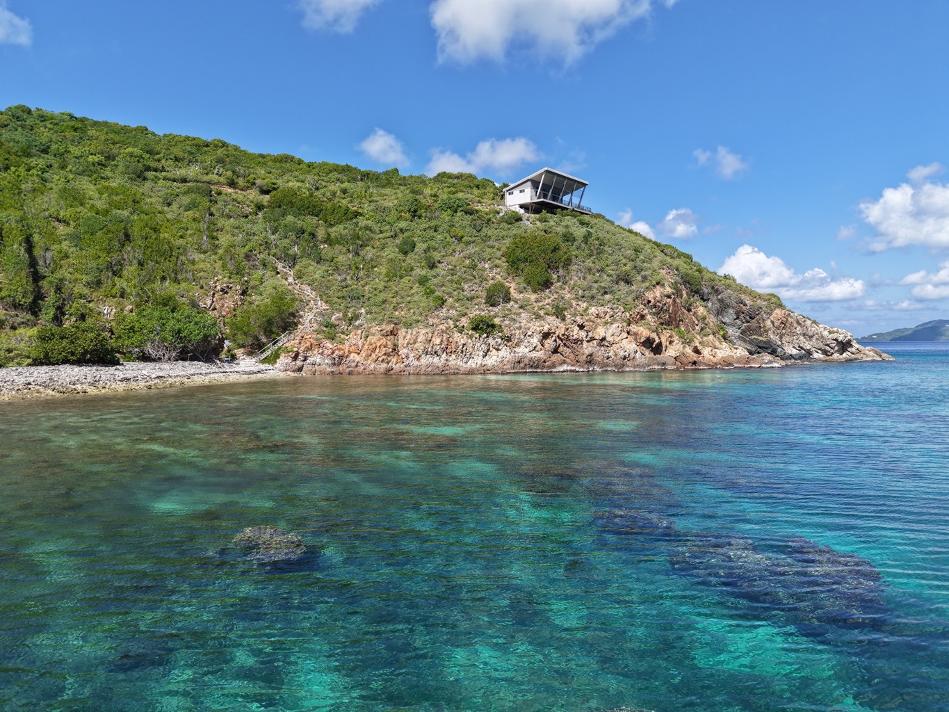 Clean contemporary interiors open to panoramic ocean views, and the cliffside deck is made for slow mornings and warm, quiet evenings. Private steps lead down to the shoreline for swimming and snorkeling in crystal-clear Caribbean water, a rare feature on St. John.
